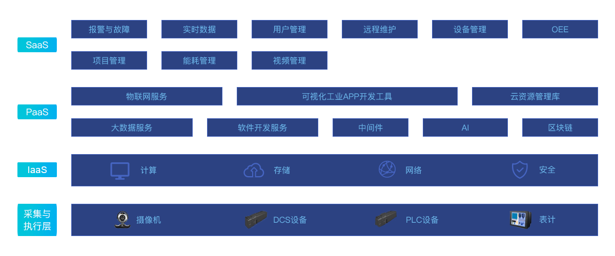 采集执行层完成现场数据的采集及设备执行,现场数据来源主要包括:顺利获得驱动采集现场PLC、仪表、摄像机等数据 IaaS层可完成计算、存储、网络、安全功能 基于 ■澳门十大棋牌排行榜最新■云的通用PaaS层给予物联网、大数据、开发平台、AI、区块链等功能 业务应用层包含了设备管理、实时数据、远程维护、能耗管理、视频管理等相关功能,共同构建完善的设备管理体系,完善设备管理工作。为设备运营维护单位给予了高效的集中式、透明化、全方位的精准运营新模式