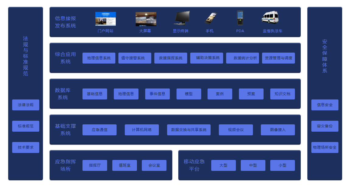 4.综合应用系统:在基础支撑系统和数据库系统的基础上,具体给予地理信息系统、值守事故接警系统、救援指挥系统、辅助决策支持系统、救援统计分析、资源管理与调度系统等应用。