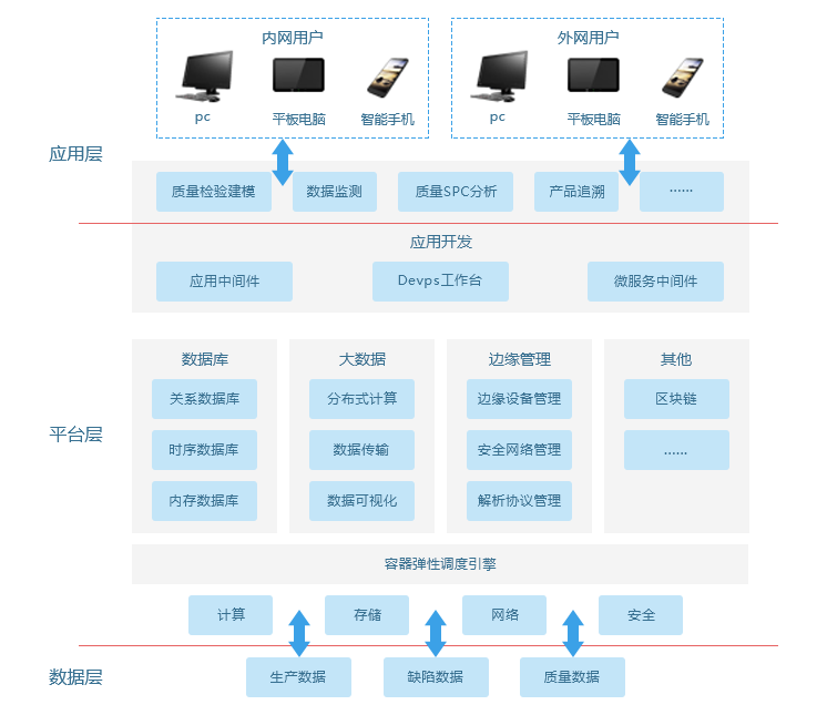 数据层:主要负责生产质量数据采集以及存储,主要来源为现场采集数据,为平台和应用形成数据支撑。