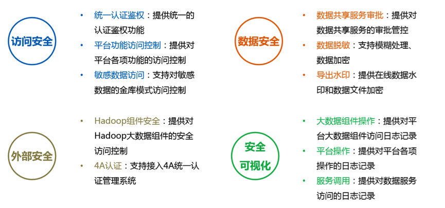 平台从访问安全、数据安全、外部安全、安全可视化等方面给予全方位的安全管控能力。