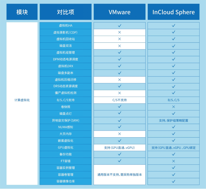 - 功能覆盖升级:在VMware90%常用功能基础上,新增裸金属和容器管理能力,支持混合业务负载智能调度,深度适配云原生场景。